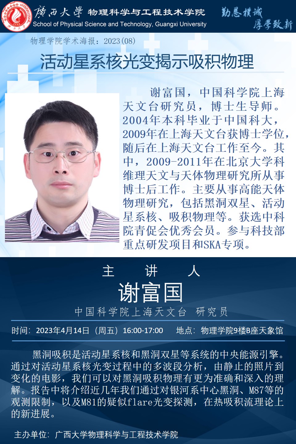 上一条:物理学院2023年学术报告系列之09:宇宙再电离时代及其宇宙学探针