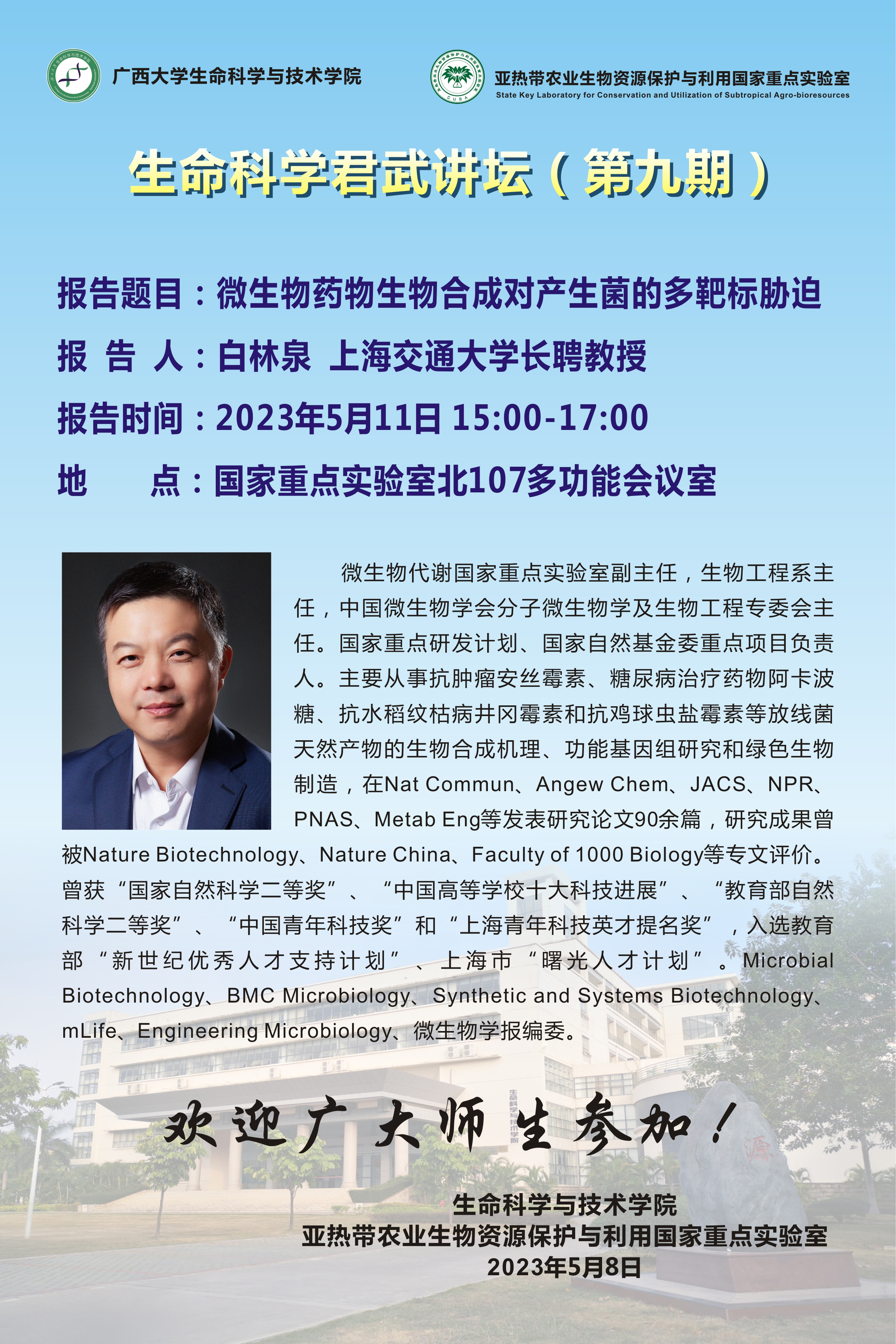 生命科学君武讲坛(第九期):微生物药物生物合成对产生菌的多靶标胁迫