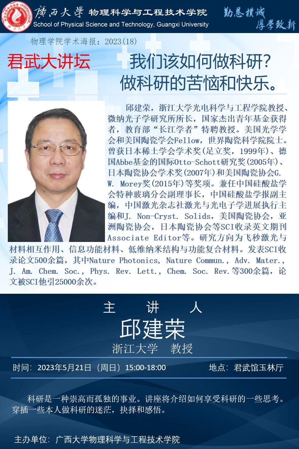 物理学院2023年学术报告系列之18:君武大讲坛——我们该如何做科研?做科研的苦恼和快乐