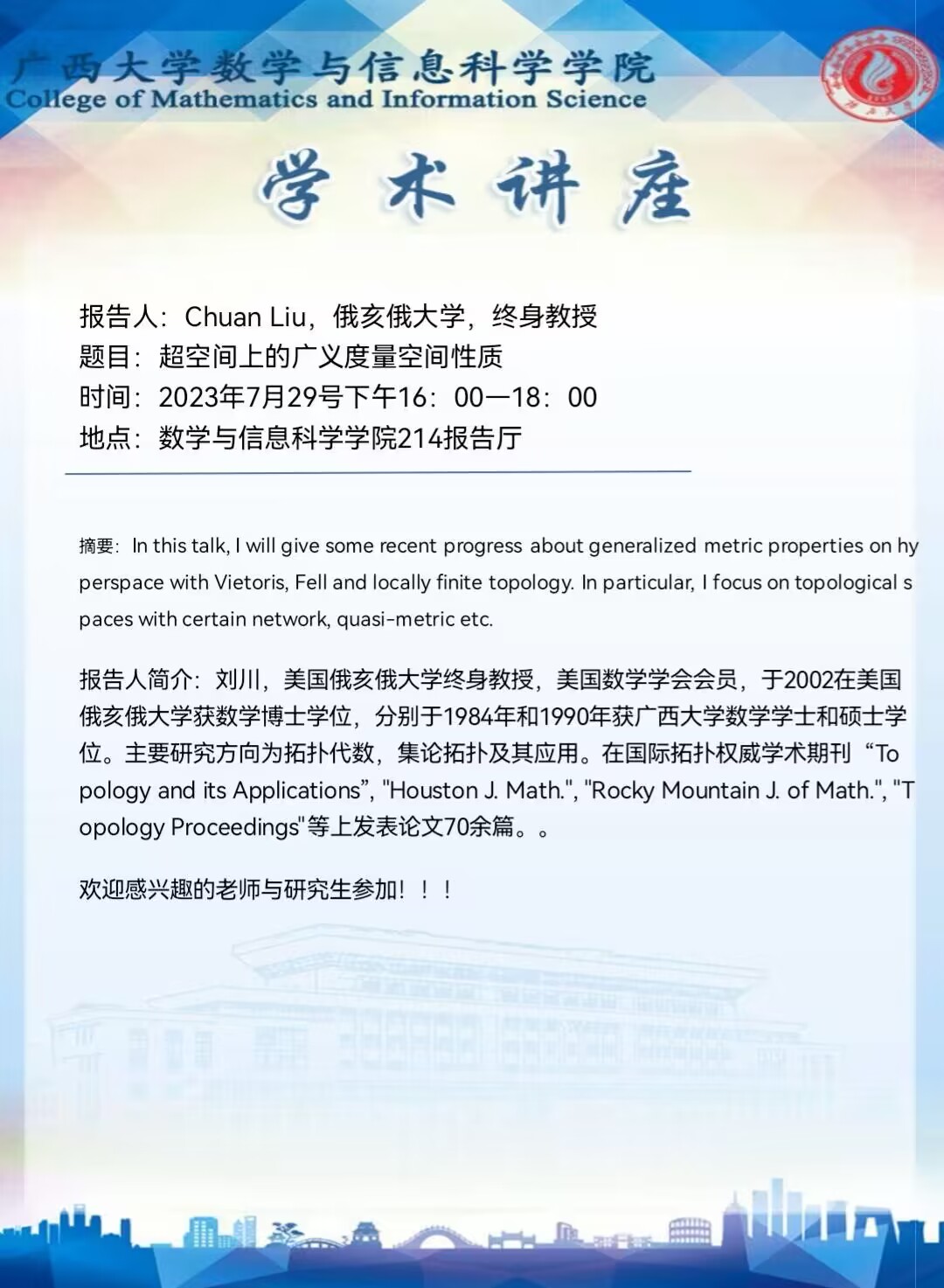 数信学院学术讲座:超空间上的广义度量空间性质