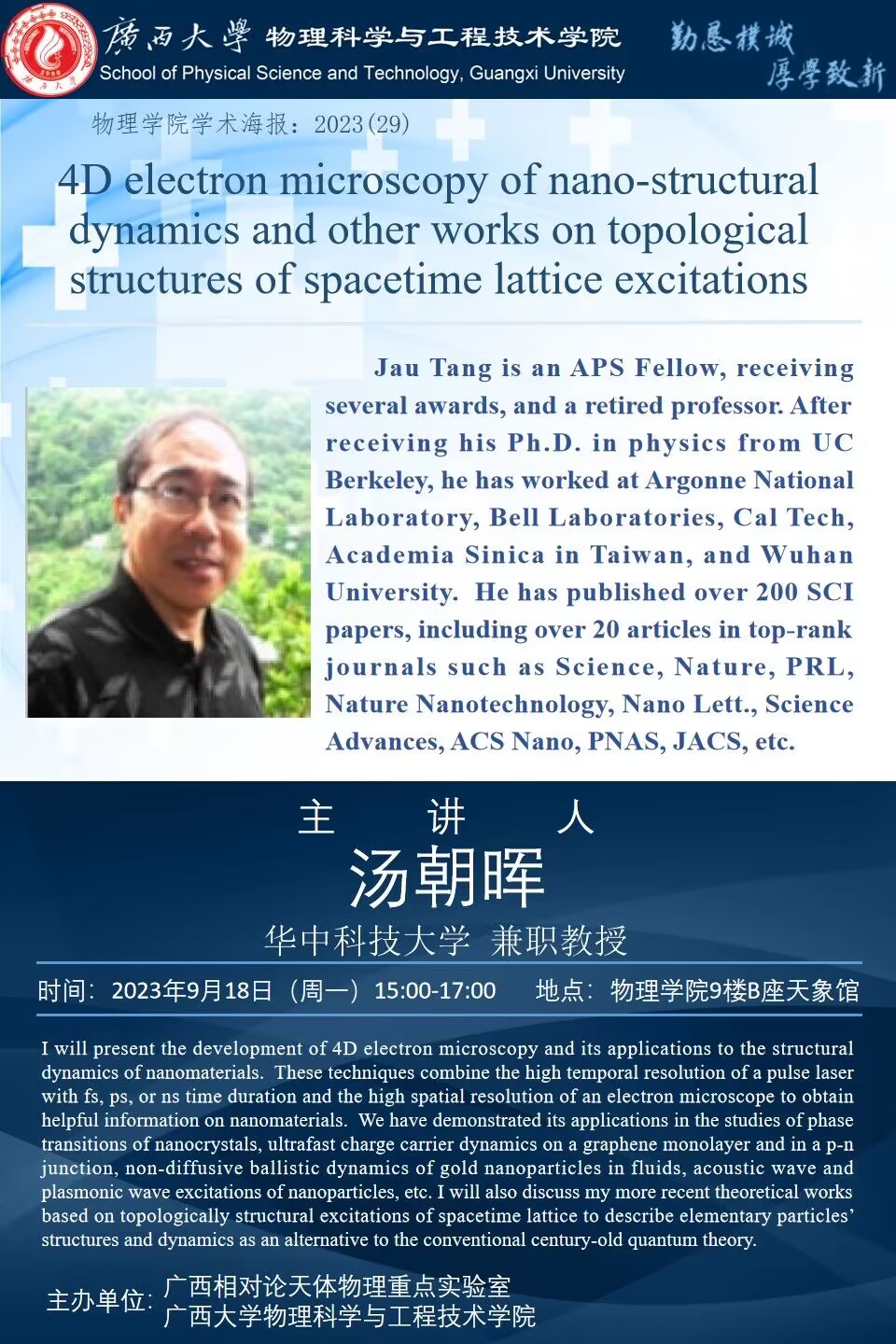 物理学院2023年学术报告系列之29:4D electron microscopy of nano-structural dynamics and other works on topological structures of spacetime lattice excitations