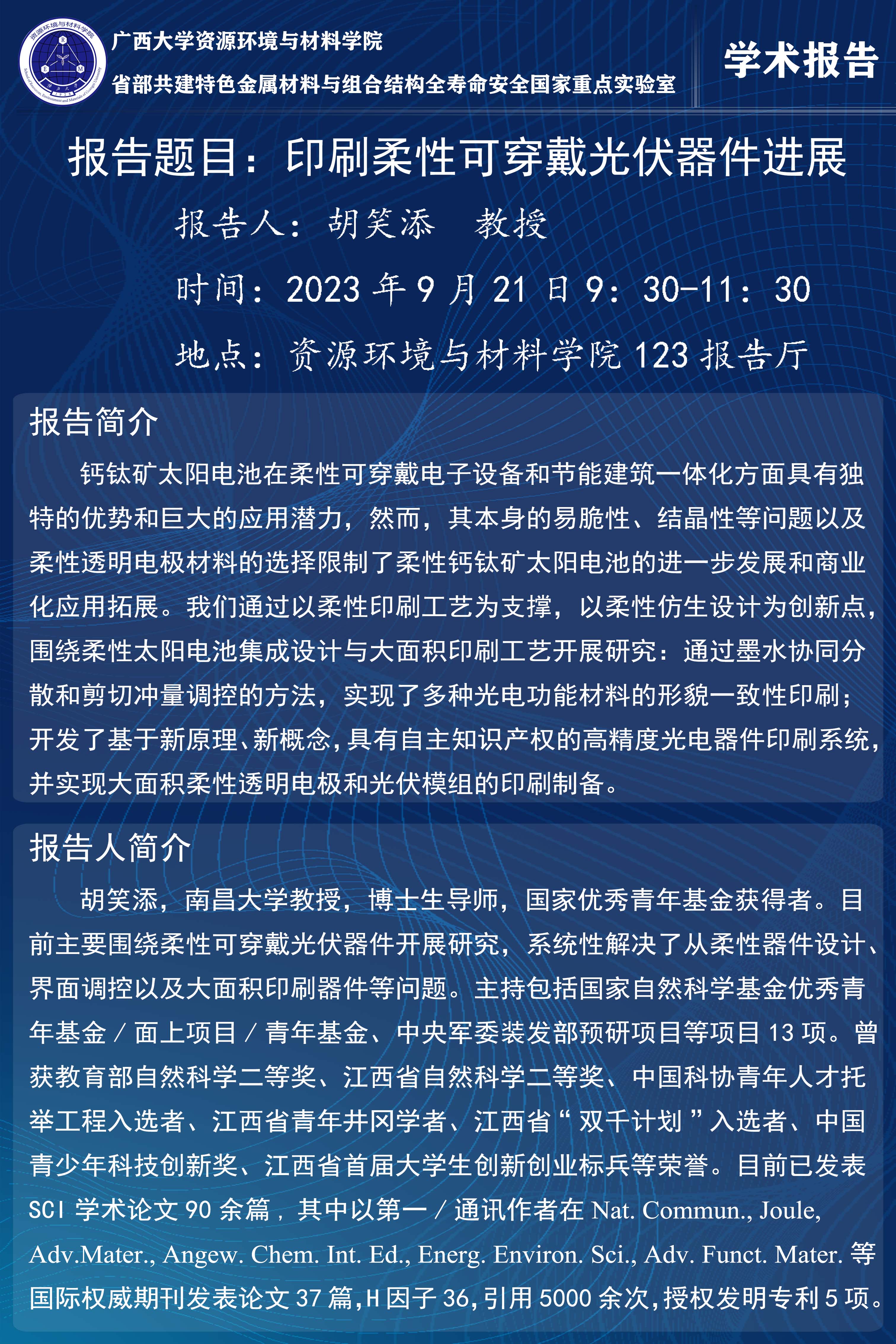 资源环境与材料学院学术报告:印刷柔性可穿戴光伏器件进展