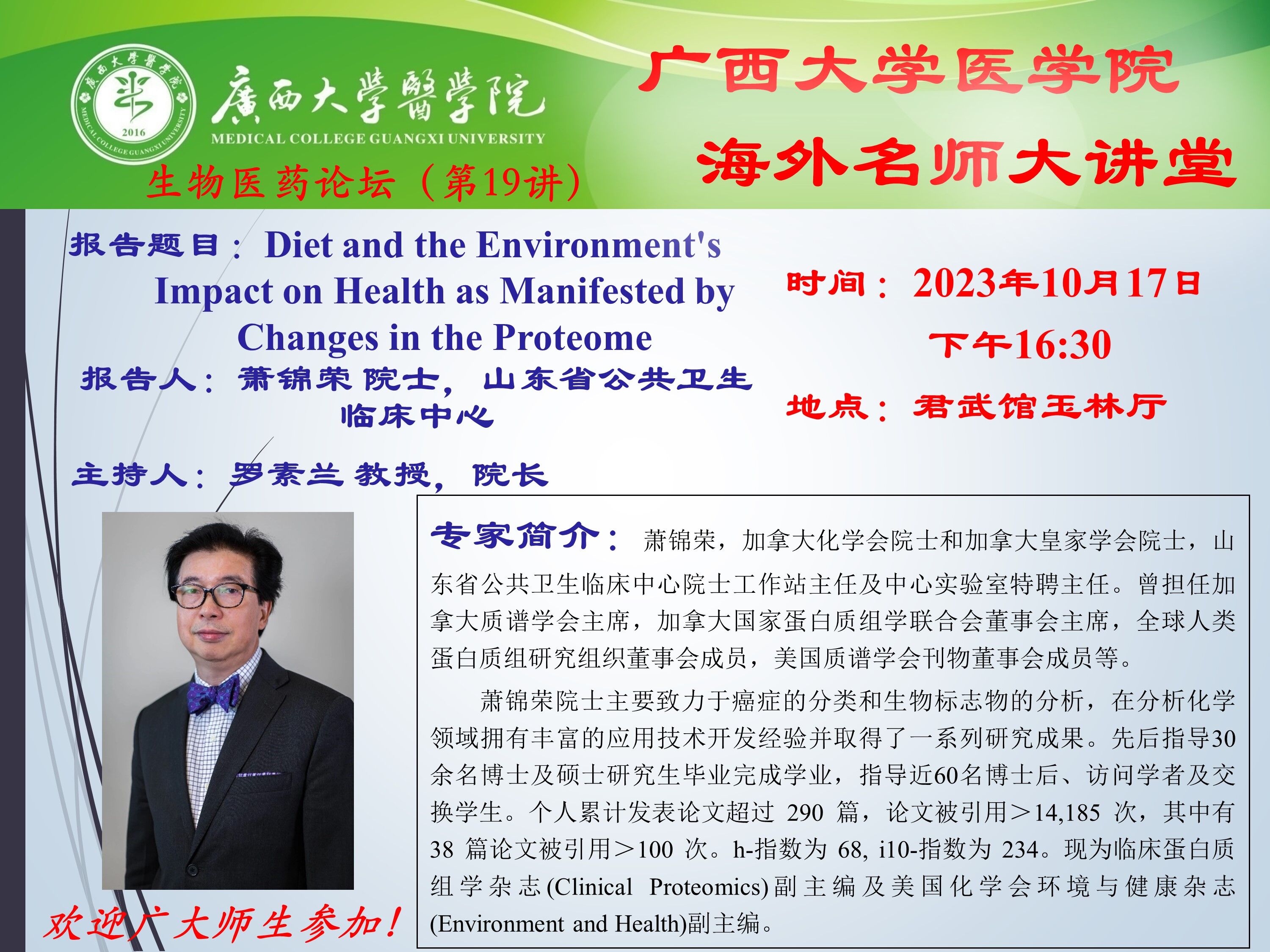 医学院生物医药论坛(第19讲):Diet and the Environment's Impact on Health as Manifested by Changes in the Proteome