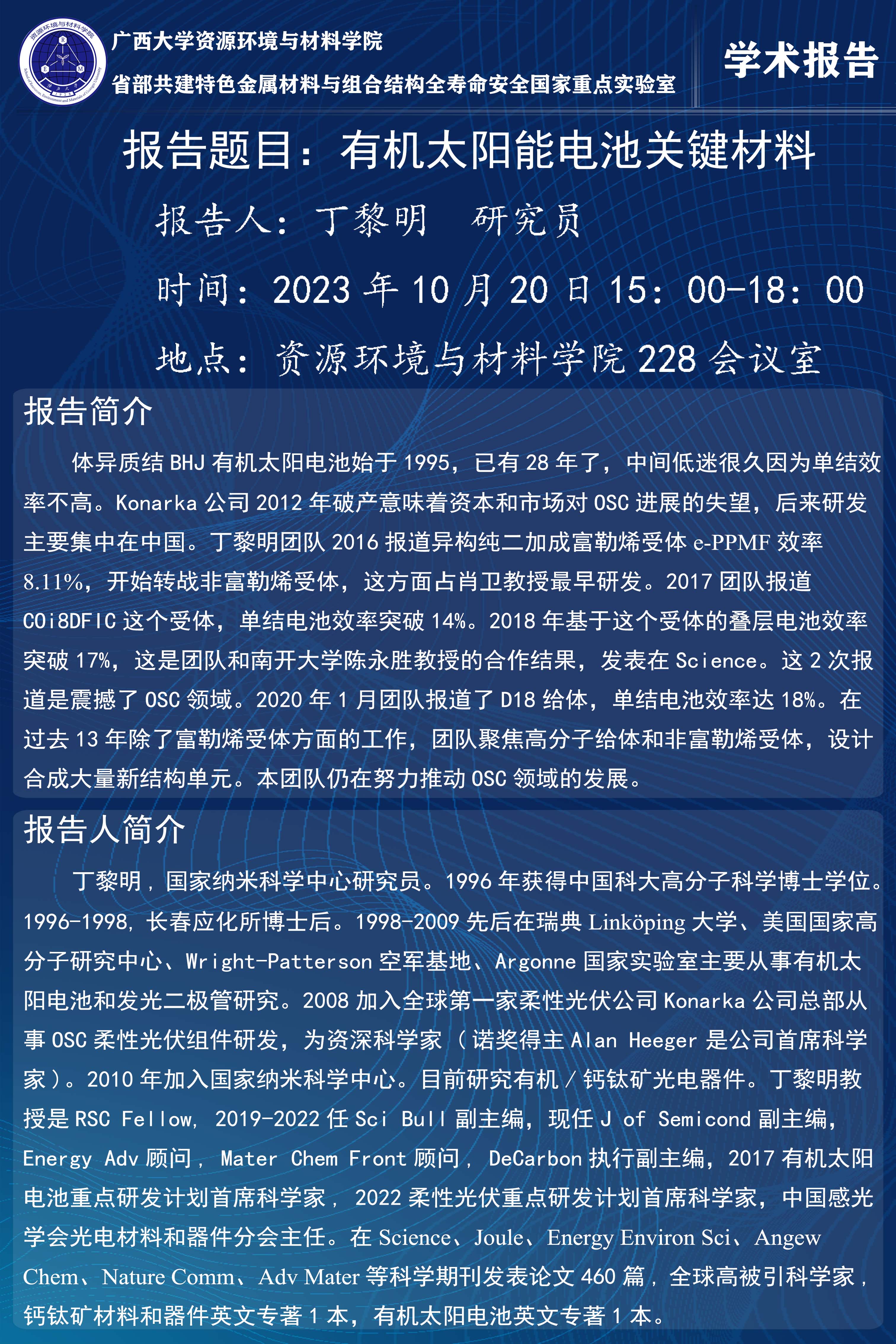 资源环境与材料学院学术报告:有机太阳能电池关键材料