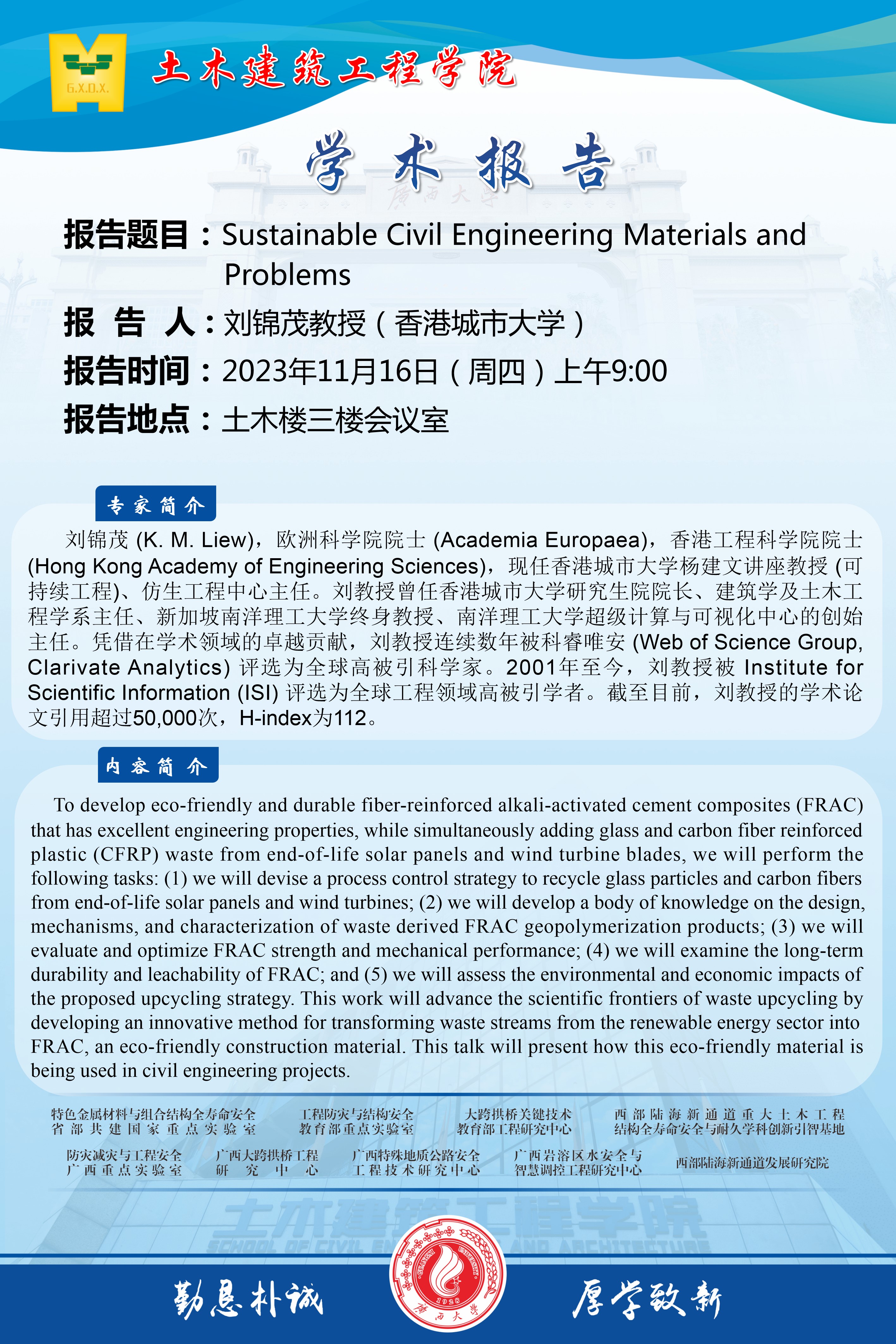 土木建筑工程学院学术报告:Sustainable Civil Engineering Materials and Problems