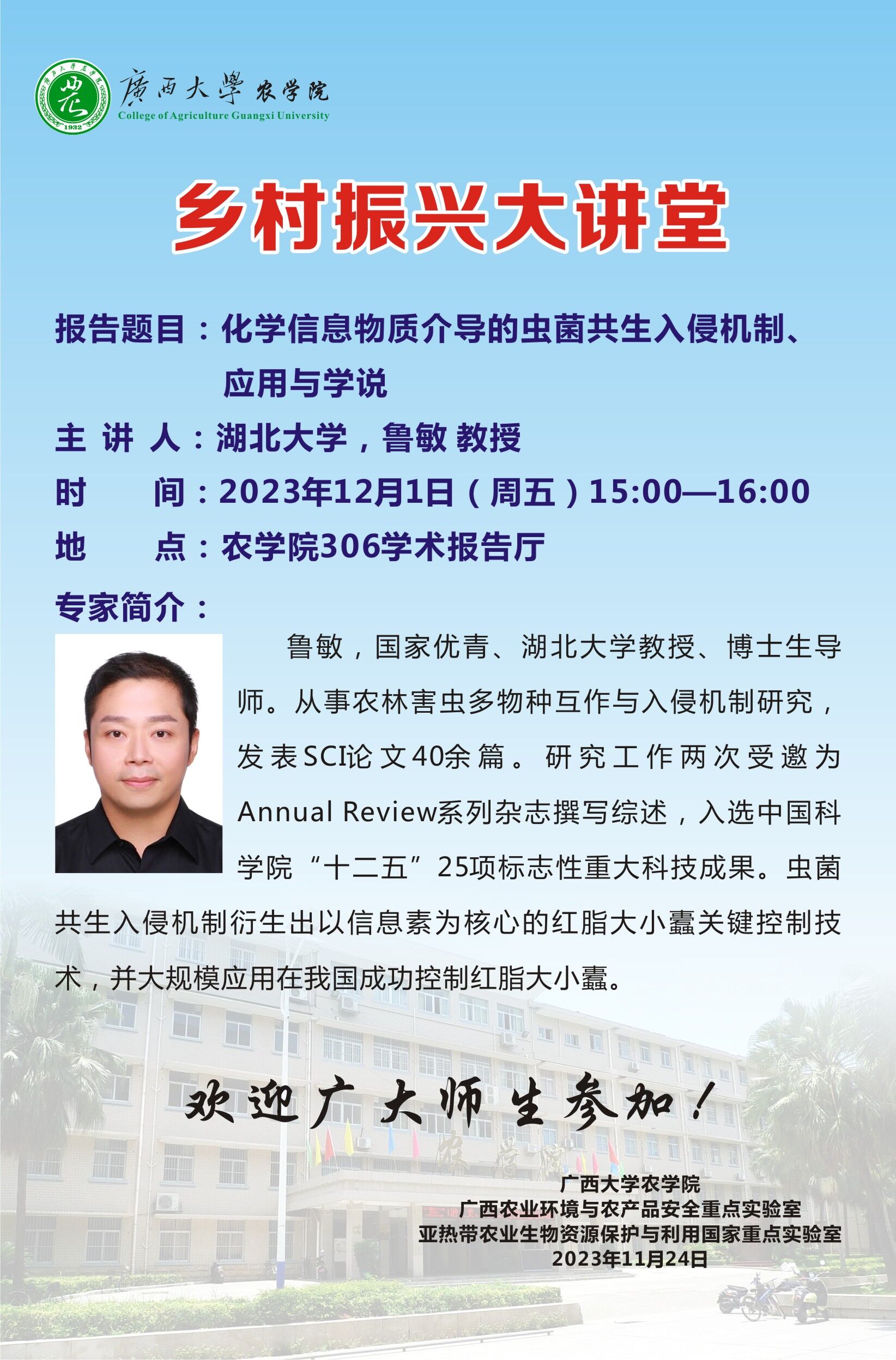 乡村振兴大讲堂:化学信息物质介导的虫菌共生入侵机制、应用与学说