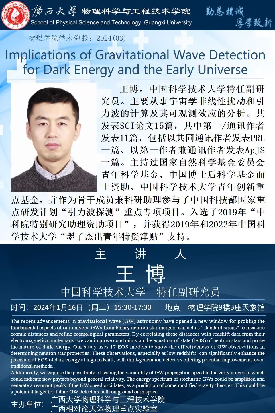 物理学院2024年学术报告之03:Implications of Gravitational Wave Detection for Dark Energy and the Early Universe