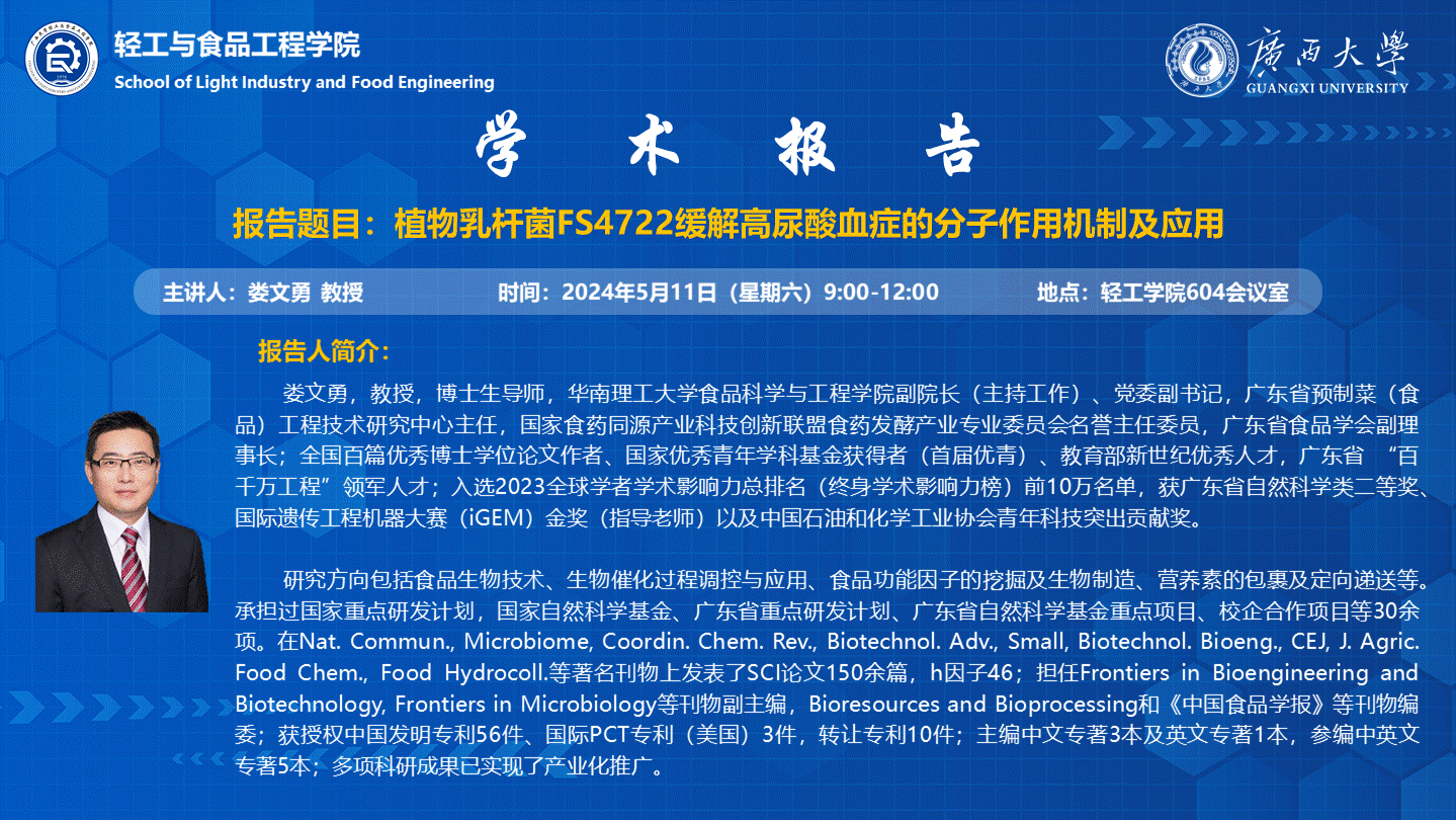 轻工与食品工程学院学术报告:植物乳杆菌FS4722缓解高尿酸血症的分子作用机制及应用