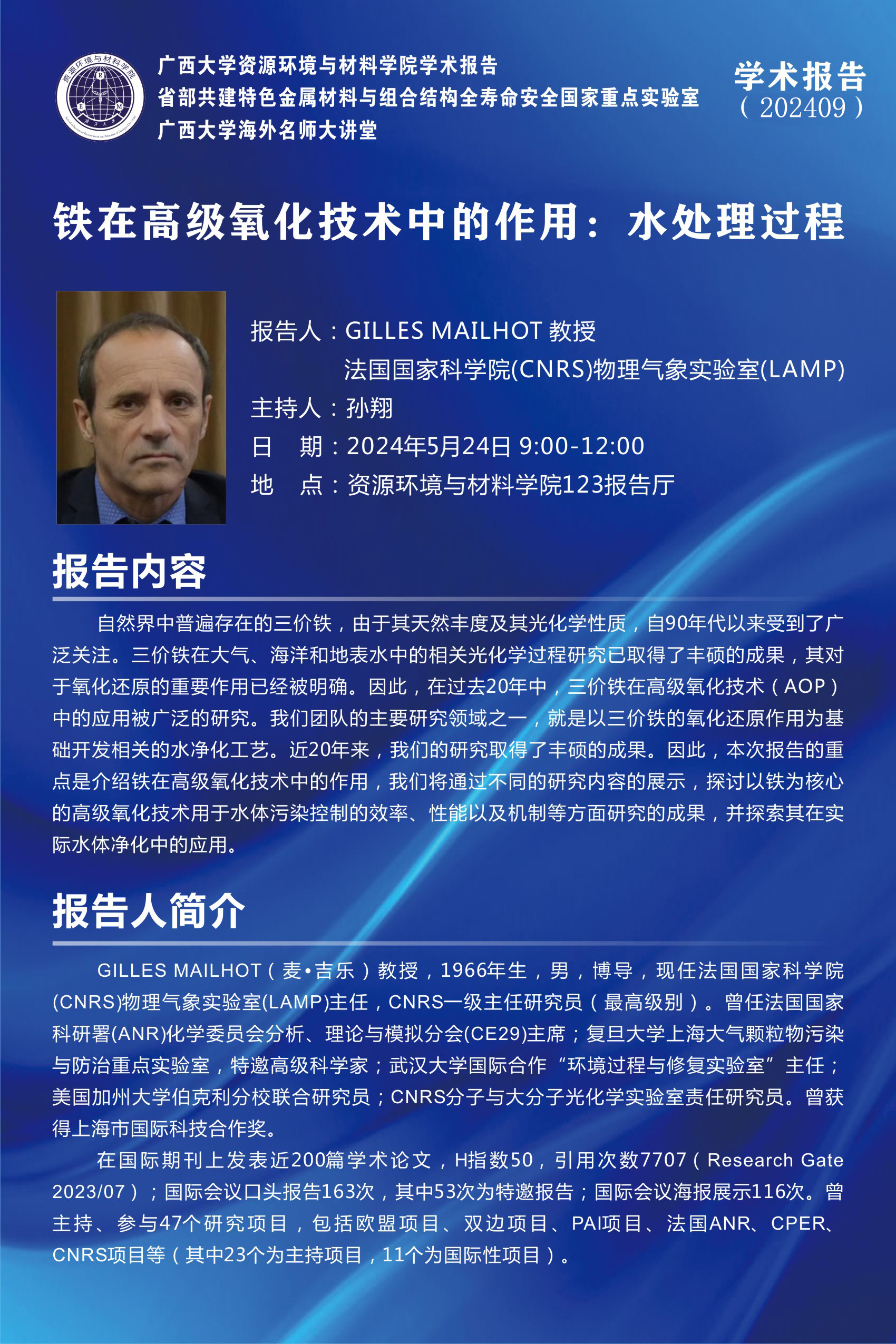 beat365正版唯一官方网站海外名师大讲堂、资源环境与材料学院学术报告 :铁在高级氧化技术中的作用----水处理过程