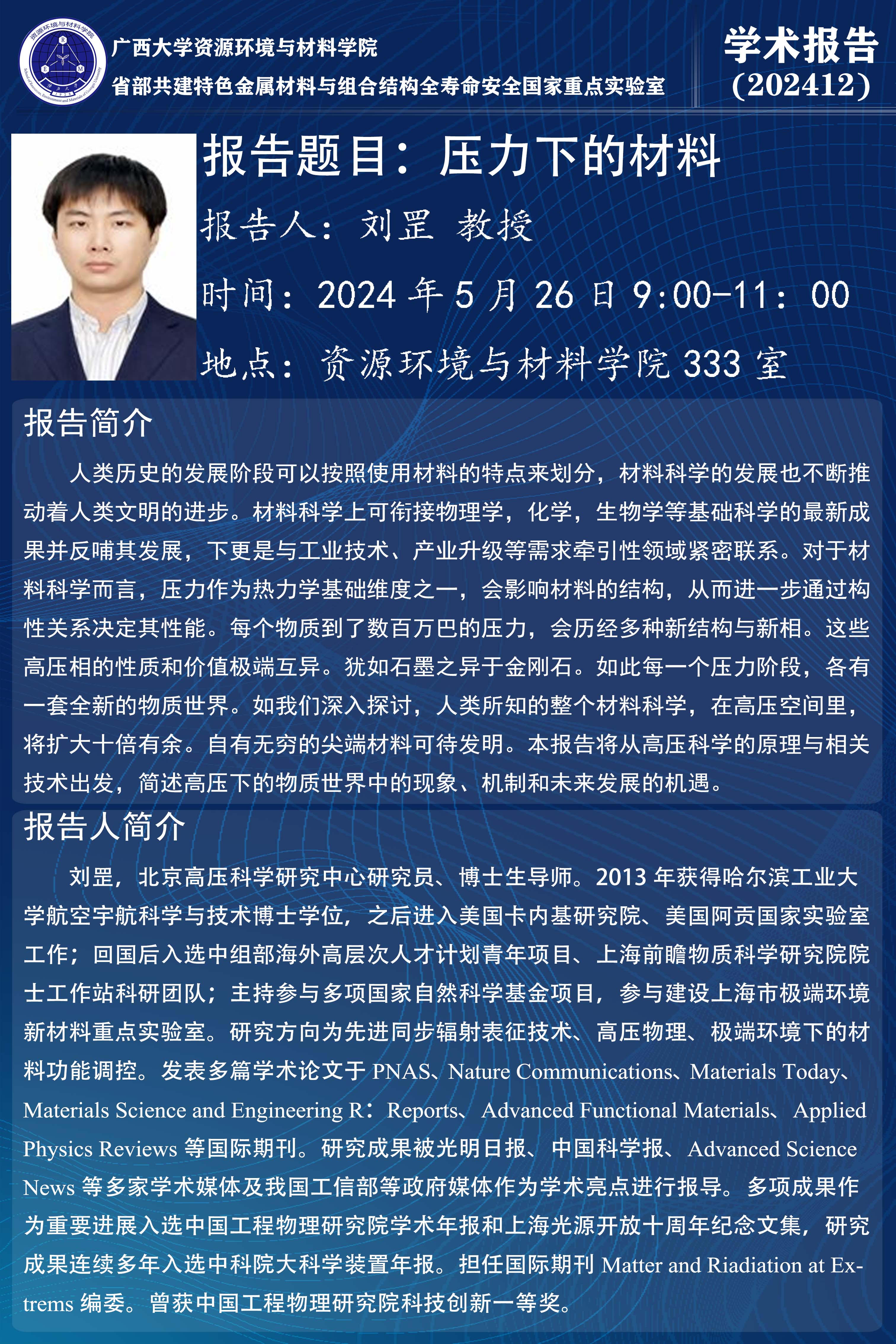 资源环境与材料学院学术报告:压力下的材料