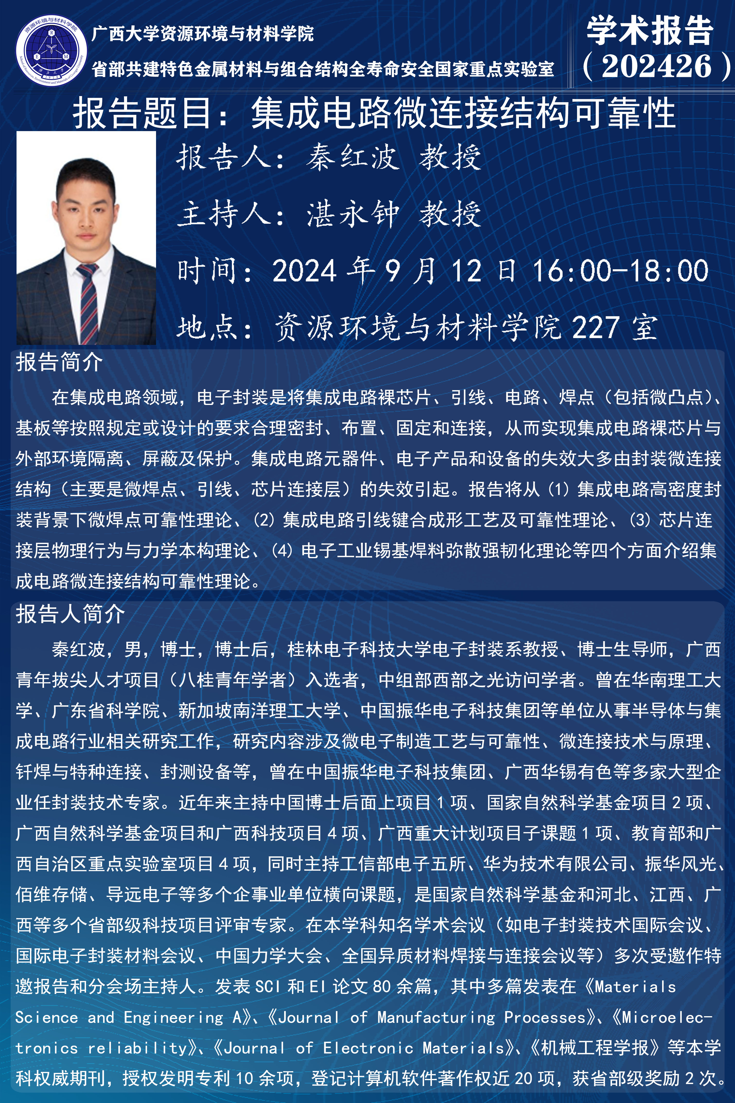 资源环境与材料学院学术报告:集成电路微连接结构可靠性