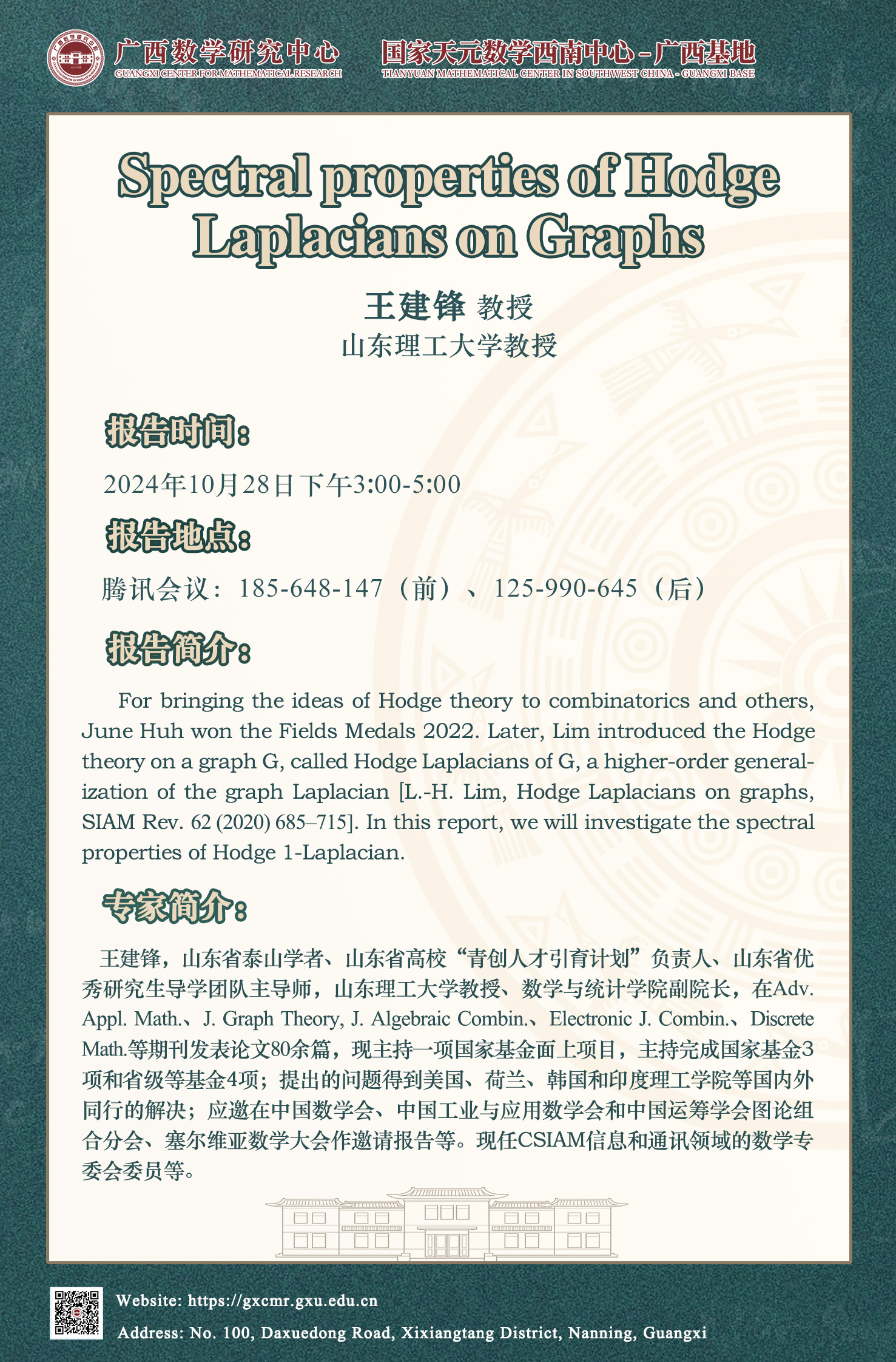 国家天元数学西南中心-广西基地、广西数学研究中心学术报告:Spectral properties of Hodge Laplacians on Graphs