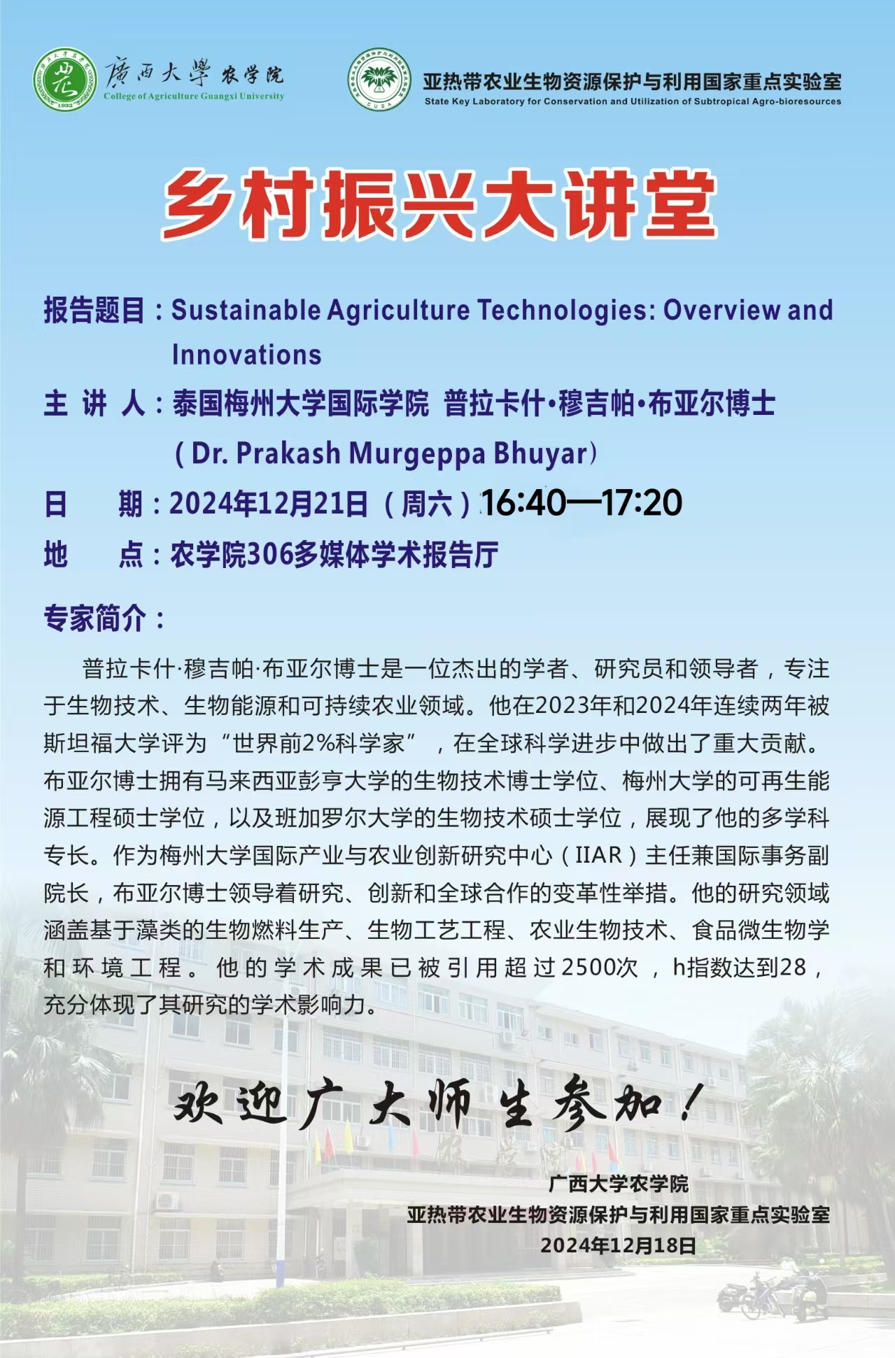农学院乡村振兴大讲堂:Sustainable Agriculture Technologies: Overview and Innovations