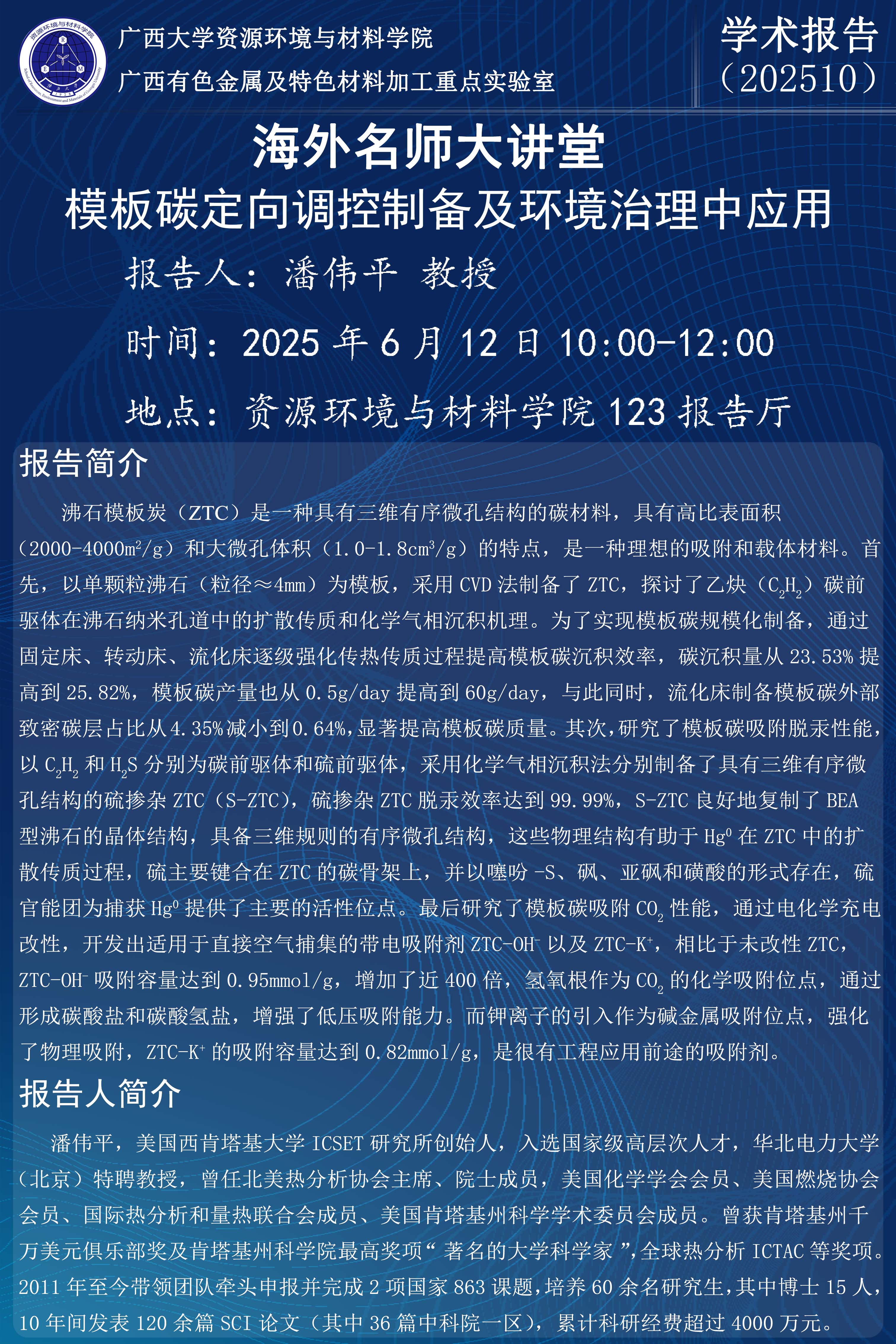 海外名师大讲堂、资源环境与材料学院学术报告 :模板碳定向调控制备及环境治理中应用
