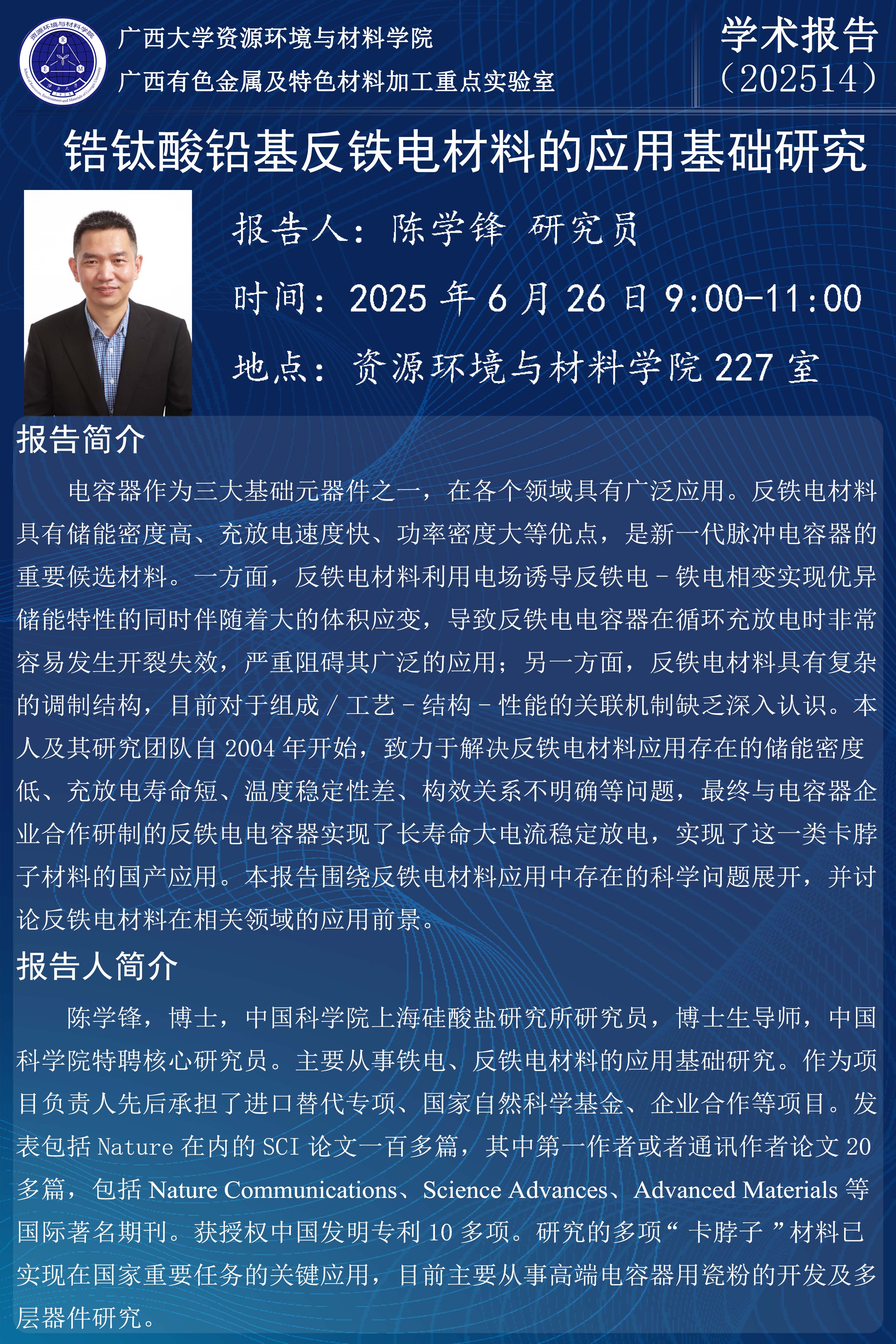 上一条:资源环境与材料学院学术报告:Enhancing Hardening Effects in Lead-Free Piezoceramics for High-Power Applications: Utilization of Point Defects