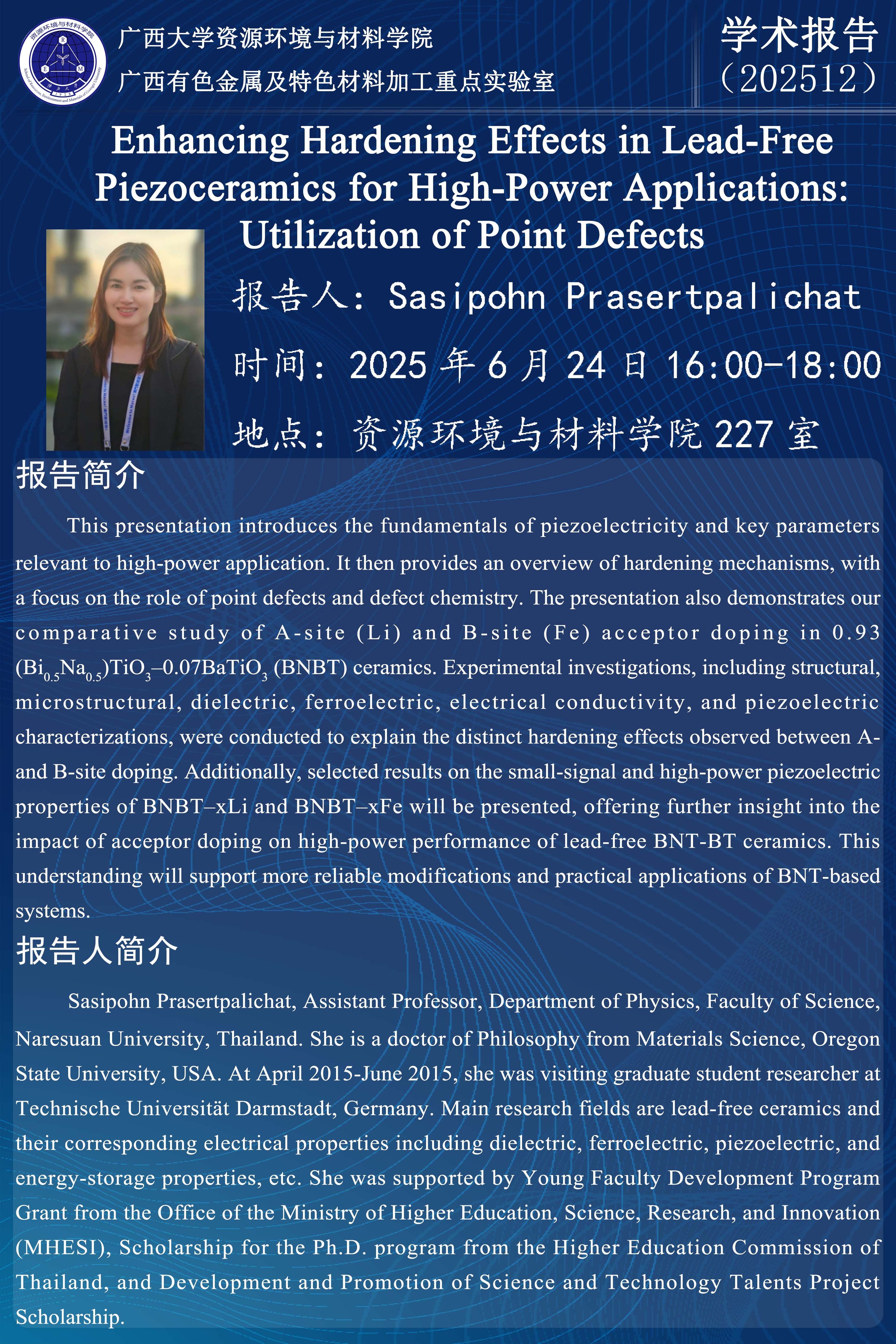 资源环境与材料学院学术报告:Enhancing Hardening Effects in Lead-Free Piezoceramics for High-Power Applications: Utilization of Point Defects