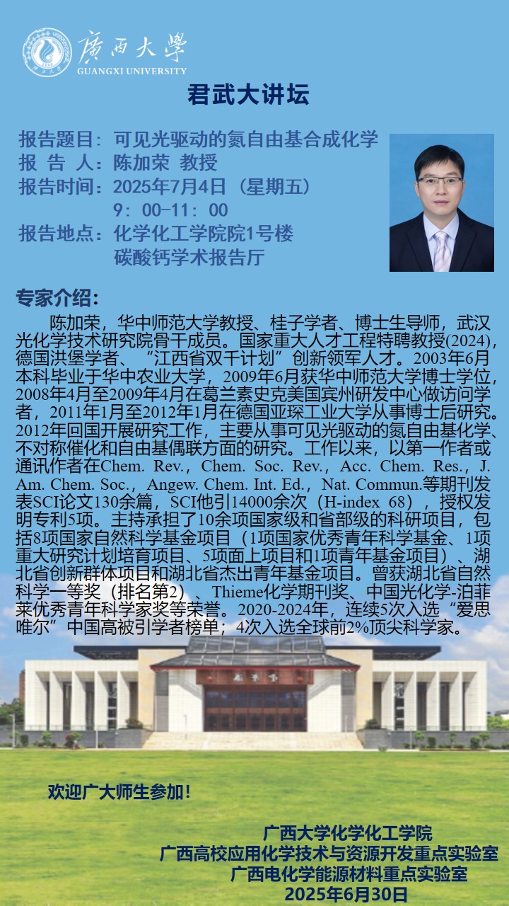 君武大讲坛:可见光驱动的氮自由基合成化学