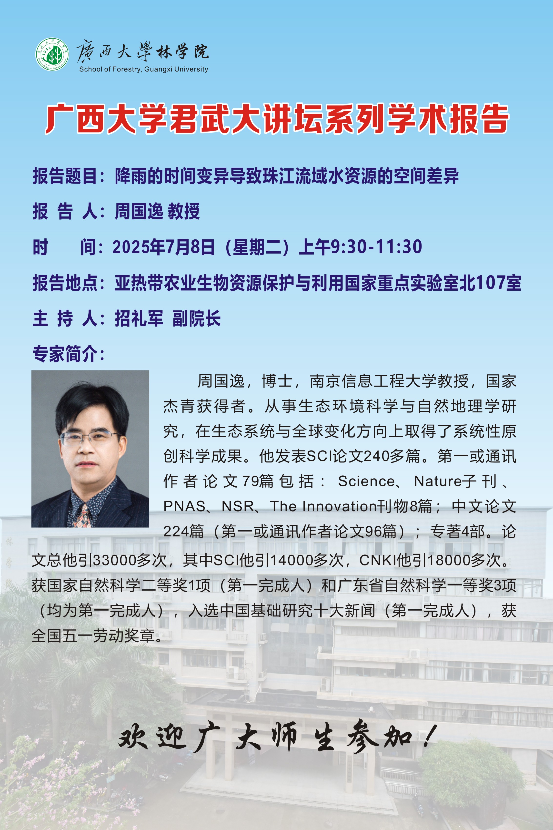 主讲人 周国逸 教授(南京信息工程大学) 地址 亚热带农业生物资源保护与利用国家重点实验室北107室