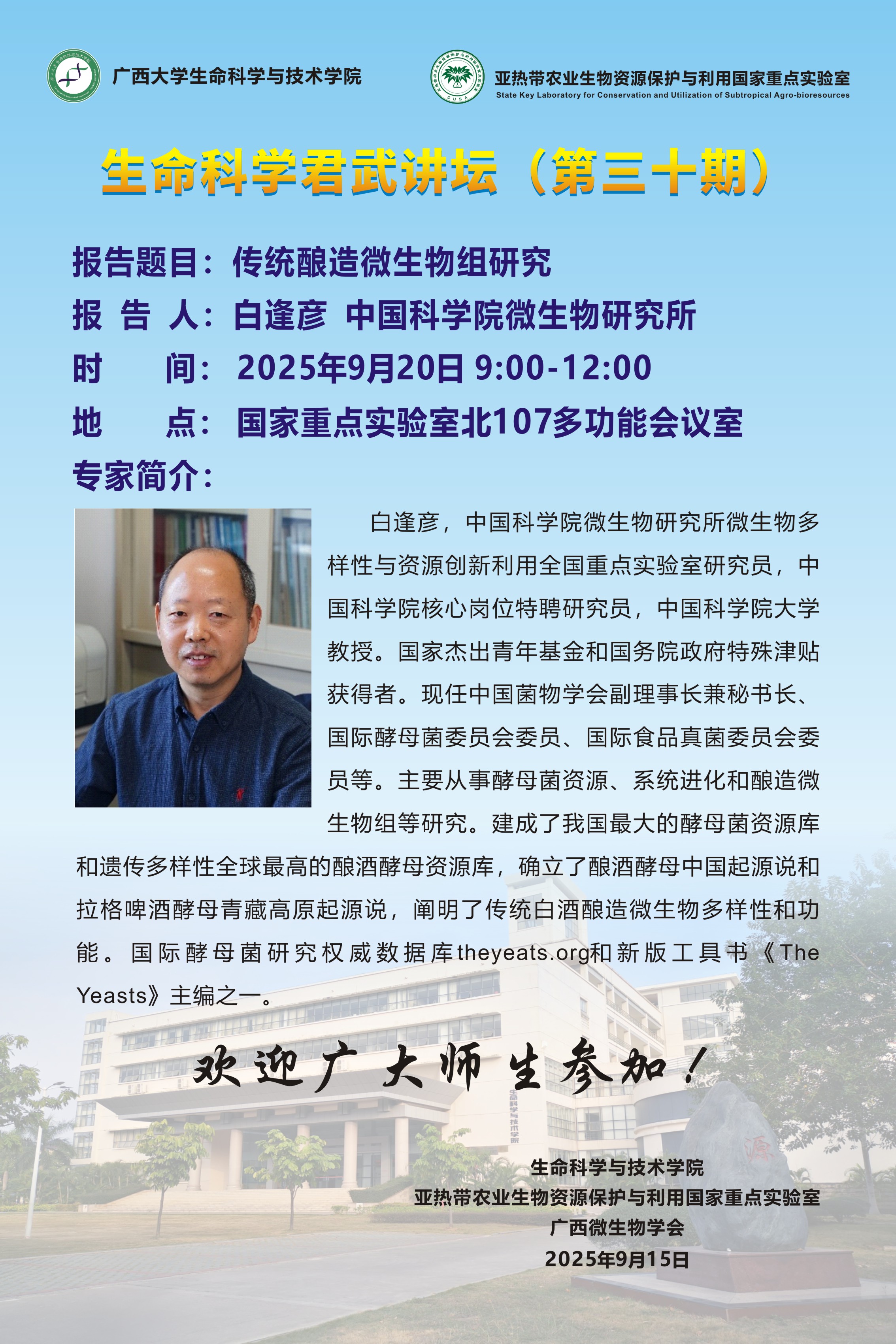 生命科学与技术学院生命科学君武讲坛第三十期:传统酿造微生物组研究