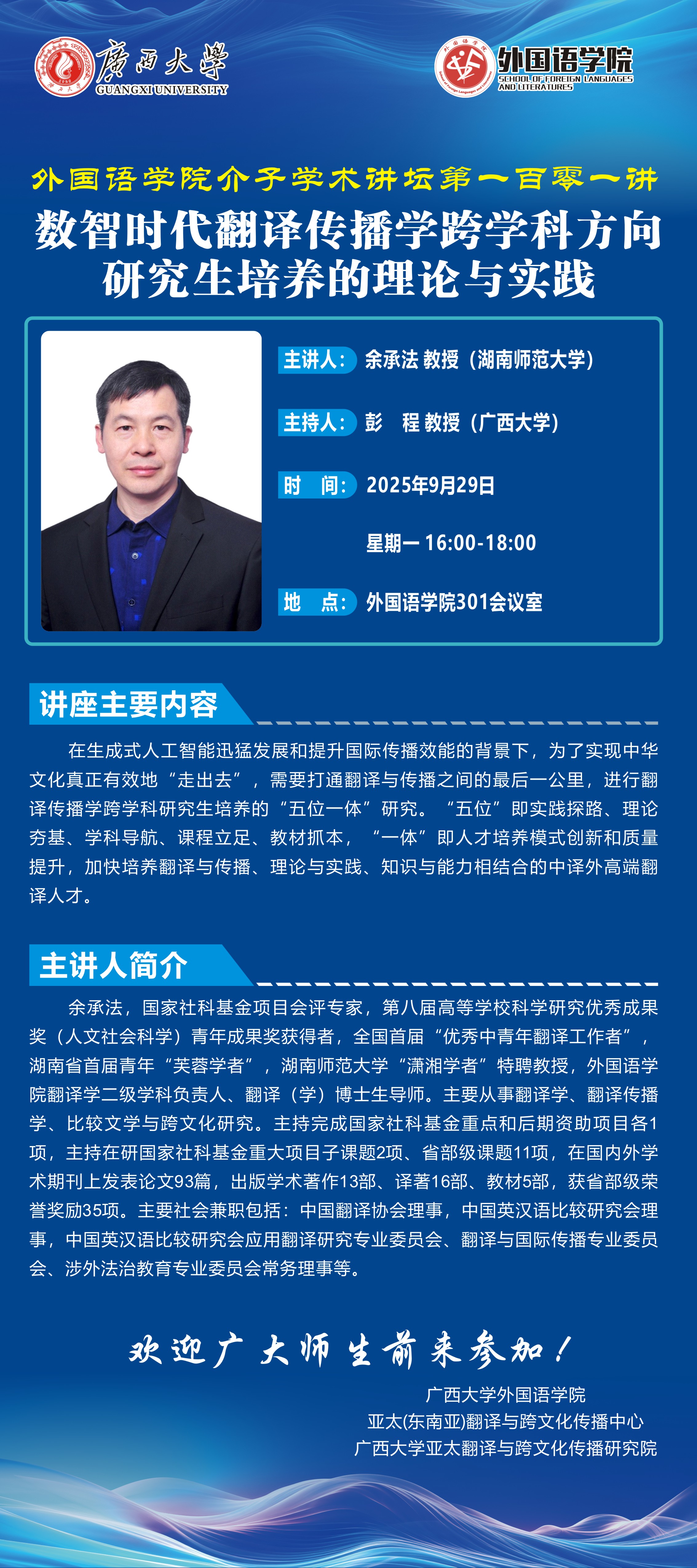 外国语学院学术报告:数智时代翻译传播学跨学科方向研究生培养的理论与实践
