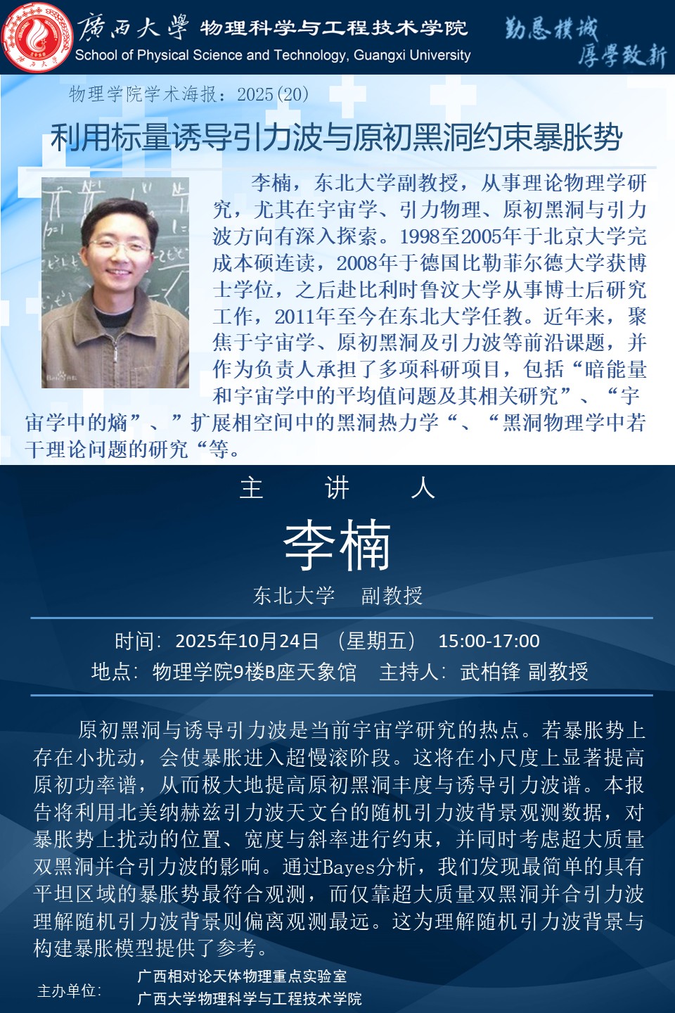 物理科学与工程技术学院学术报告:利用标量诱导引力波与原初黑洞约束暴胀势