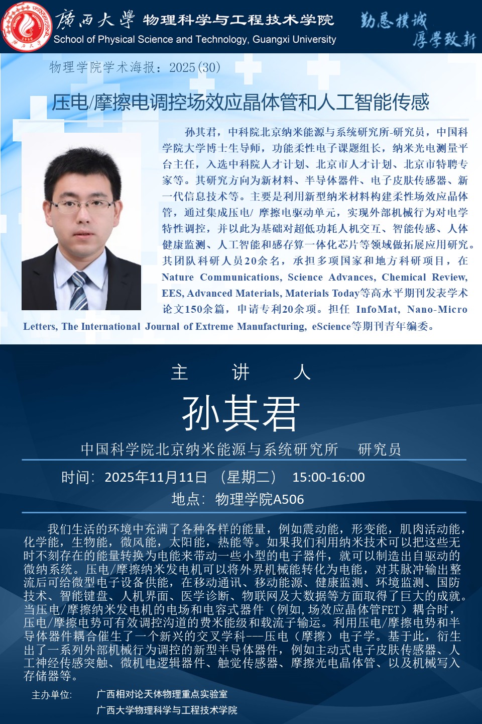 物理科学与工程技术学院学术报告:压电/摩擦电调控场效应晶体管和人工智能传感