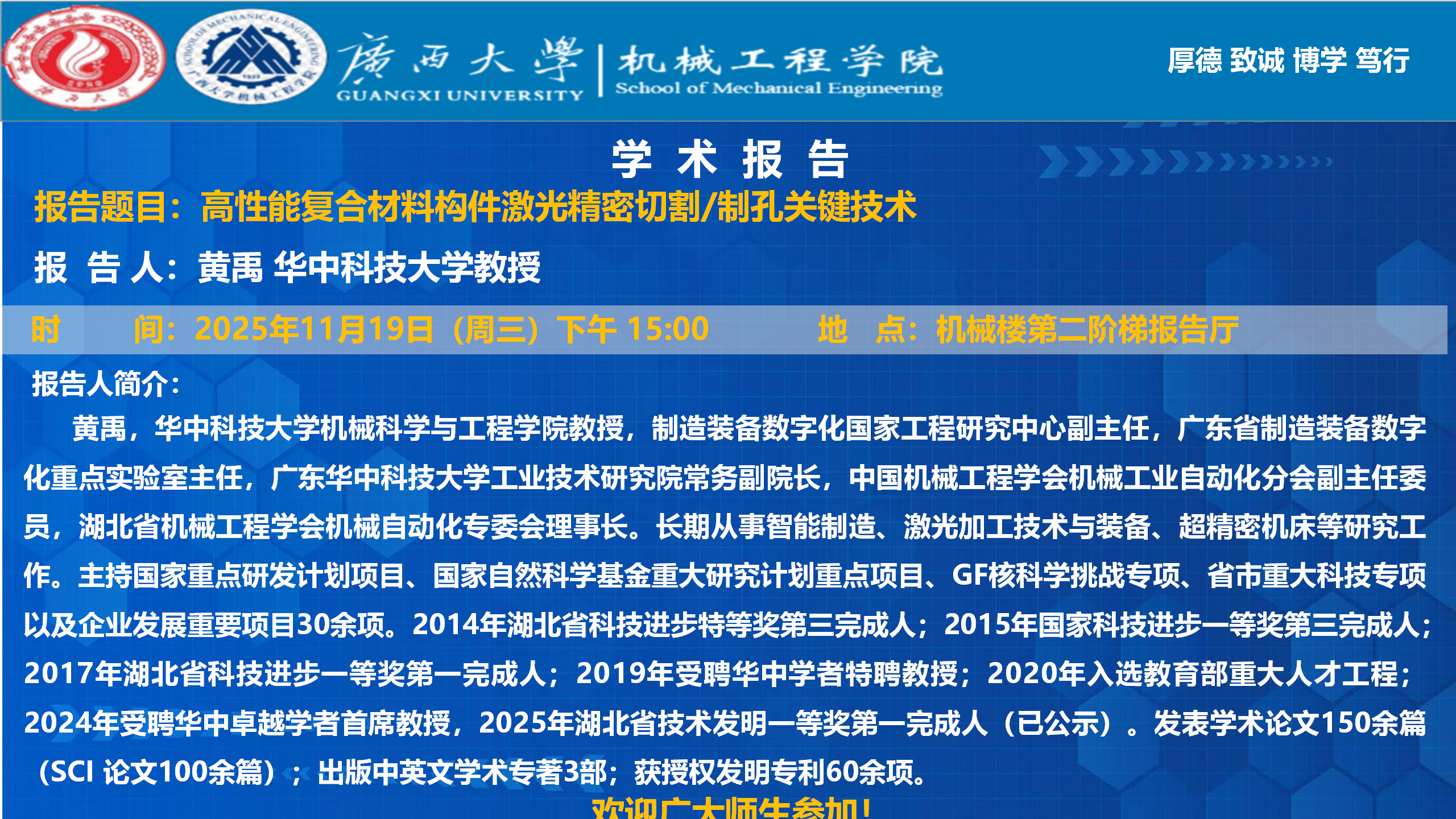君武大讲坛、机械工程学院学术报告:高性能复合材料构件激光精密切割制孔关键技术