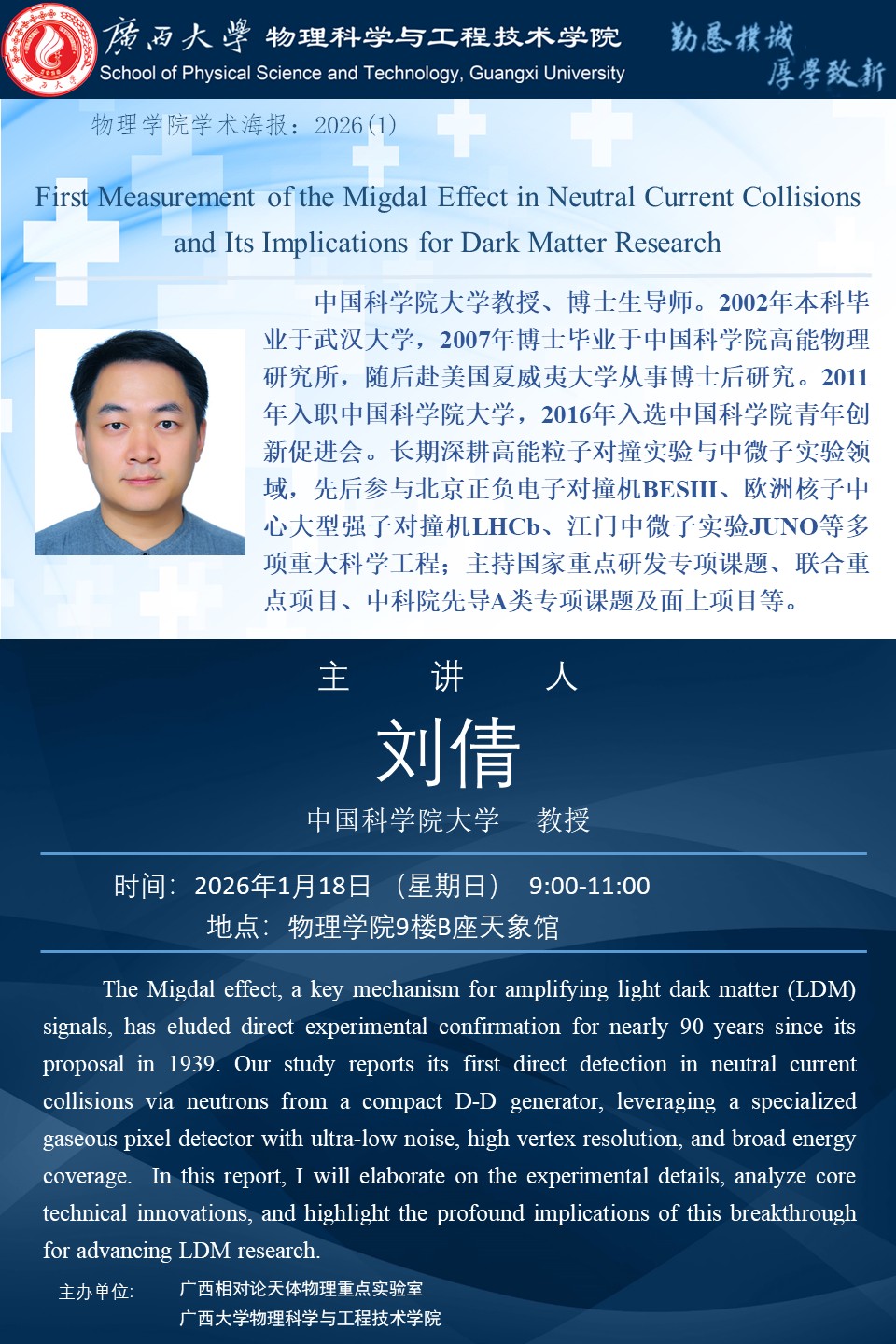 物理科学与工程技术学院学术报告: First Measurement of the Migdal Effect in Neutral Current Collisions and Its Implications for Dark Matter Research