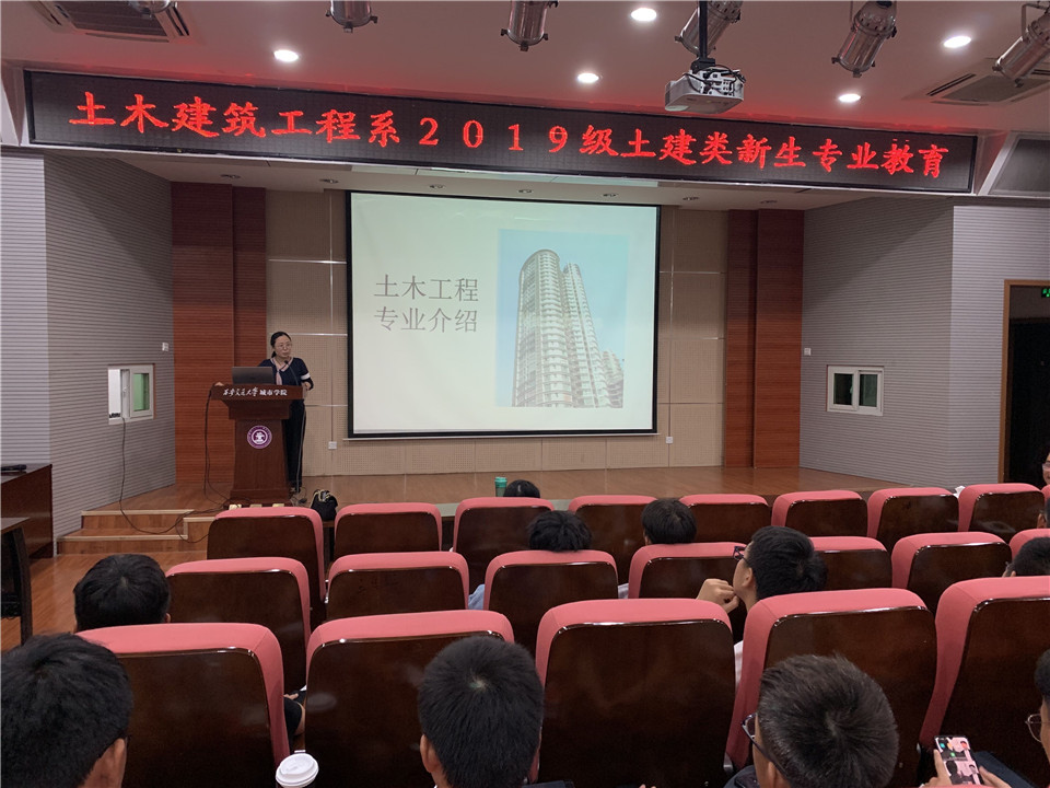在系列教育活动的开始环节,土建系全体教职工与新生进行集体见面交流,系主任廖红建教授代表土建系对同学们表达了最热烈的欢迎并寄语他们不忘初心,珍惜时光,学好本领,回报国家。老师们通过简短的演讲,阐述了建筑行业新形势、新方向,未来建筑行业的美好前景,自信能够和同学们一起不负重托,共同发展。在专业认知教育中,主任助理康彦青、黎莹结合专业特点,详细的为同学们介绍了建筑环境与能源应用工程和土木工程两个专业的培养方案、培养目标与具体教学方案,以及专业考研、就业方向与各项竞赛情况,引导学生熟悉大学专业教育的模式,切合自身能力,制定科学的学业与职业规划。在行为养成、党团知识教育环节,系学生主管牛彦龙为同学进行了《勿忘初心,心怀梦想,励志成才》主题讲座,从自我认知,价值目标,思想政治,课外实践等八方面要求同学们对照做到“当代大学生要做好的八件事”,并带领学生认真学习了《学生手册》中学籍、管理、奖惩等内容。他还通过专题辅导,结合实例对大学生课外十学分具体实施方案、公寓创优工作等进行详细的讲解和说明。系团工委书记张莹在党团教育环节中,对学生进行了入党启蒙教育,重点就加入党组织所具备的必要条件做了要求和动员。并结合我系团学工作理论和相关活动,引导新生积极参与各类课外实践活动,提升个人的综合素质。在参观实践环节,系实验室主任龙玉成及相关老师组织新生对各类实验室进行参观,并对我系的实习实训基地进行详细的介绍,帮助新生更为深入的认识所修专业,加深对专业学科与技术应用的理解;在实践教育中,我系还将新生教育与品牌活动“建筑之声”有效结合,邀请全国建筑业“大国工匠”周敏高级工程师为新生进行《努力做一名中国建筑节能排头兵》的专题报告,重点关注专业的发展机遇及毕业后的从业方向,拓宽思维和视野,激发学生的学习热情。