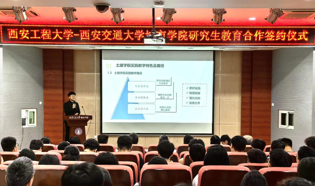 签约仪式后,学校土建学院实验中心负责人戴世安从土建学院实践教学特色、实验中心组成及实践能力培养模式等方面汇报了我校学生培养情况。西安工程大学强天伟教授和刘洋教授分别对建筑环境与能源应用工程、土木工程两个专业的基本情况和发展前景进行了宣讲,并鼓励学生积极报考西安工程大学。