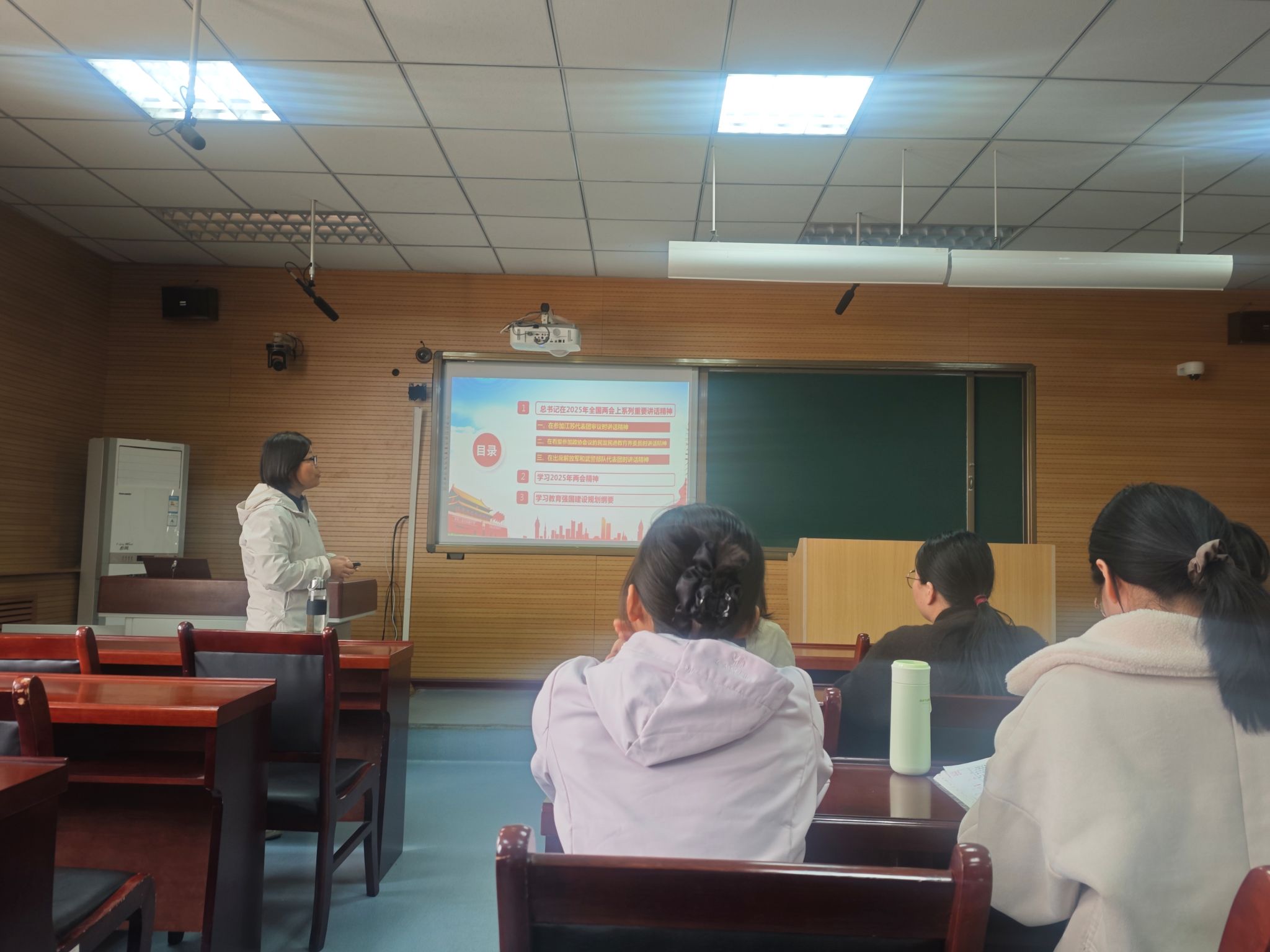 郭秀芹首先带领全体党员集中学习了两会期间习近平总书记在参加江苏代表团审议时讲话精神、在看望参加政协会议的民盟民进教育界委员时讲话精神、在出席解放军和武警部队代表团时讲话精神,同时她传达了两会期间政府工作报告,带领全体教职工学习了教育强国建设规划纲要,她强调教职工要深刻领会总书记重要讲话精神,紧密结合学院工作实际,将两会精神融入教育教学、科研创新和人才培养中,立足本职岗位,勇于担当作为,以实干作答,为教育强国建设做出应有的贡献。