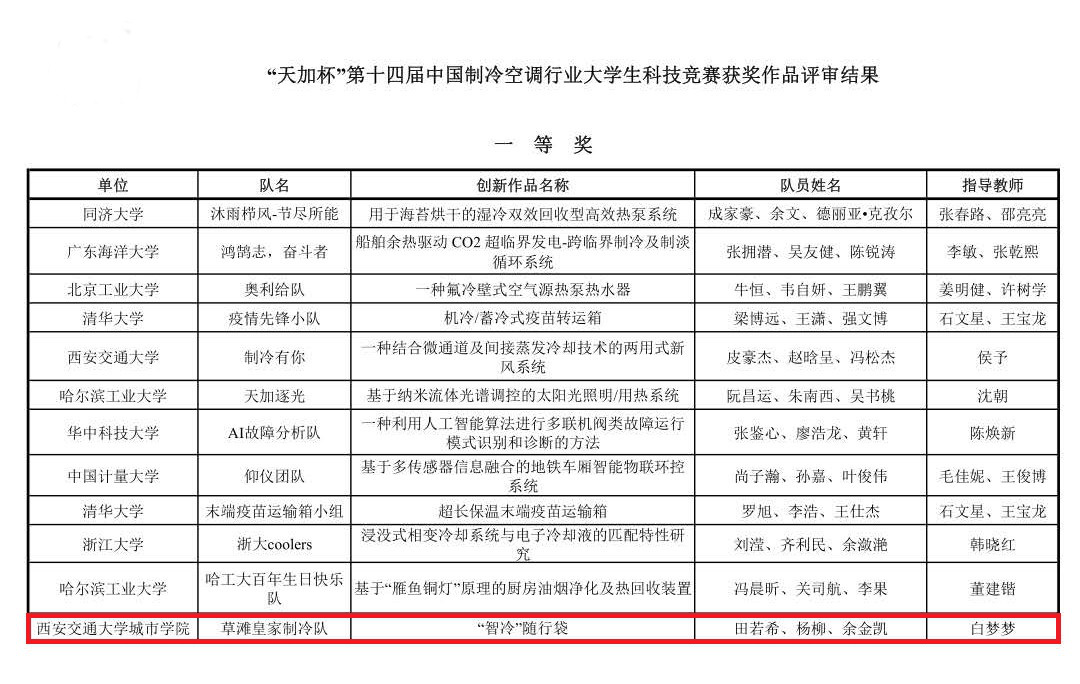 土建系获第十四届中国制冷空调行业大学生科技竞赛全国一等奖