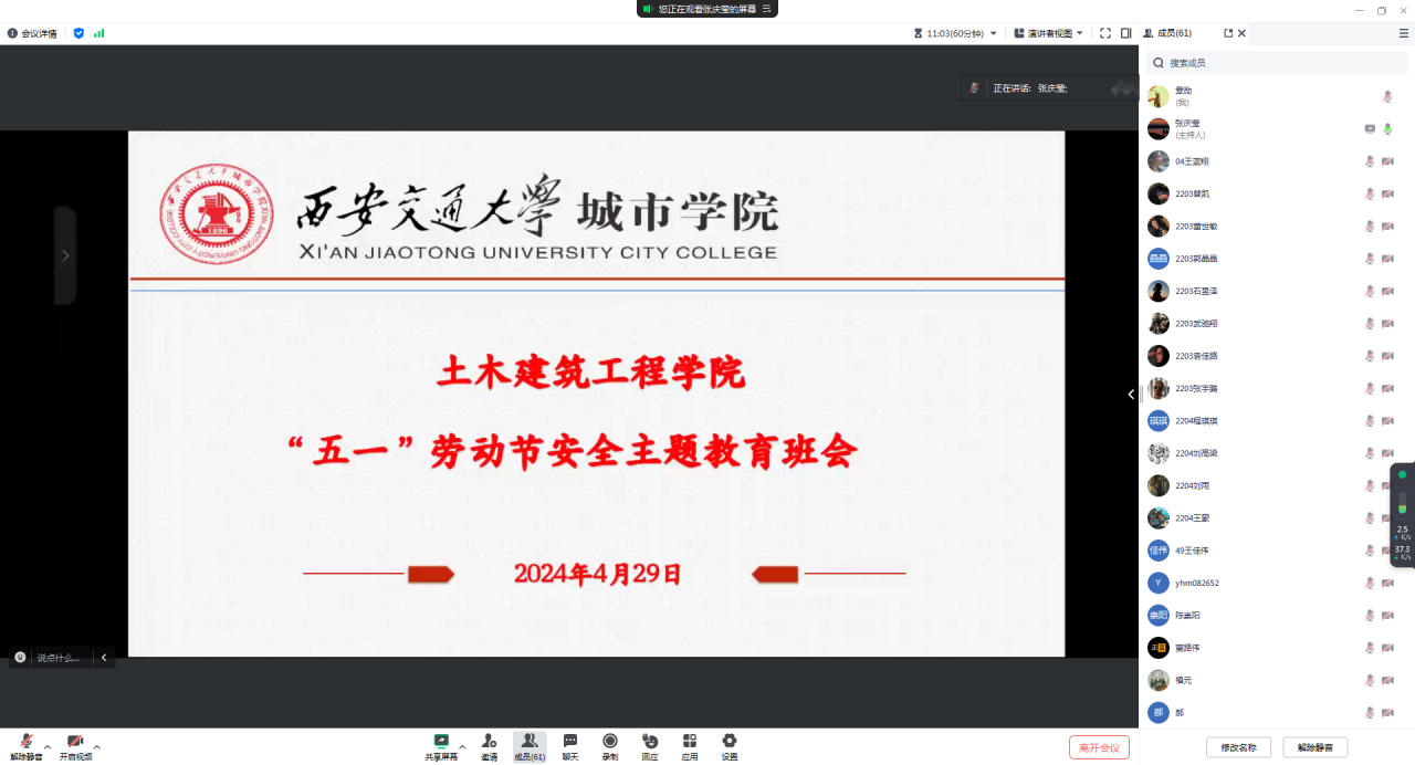 五一假期即将来临,这是一个大家期盼已久的小长假。但是,随之而来的是大规模的出行潮。为了确保大家在五一假期中的安全,土木建筑工程学院于2024年4月24-28日分别在线上线下开展了假期安全主题班会,旨在提醒大家注意出行安全和消防安全。