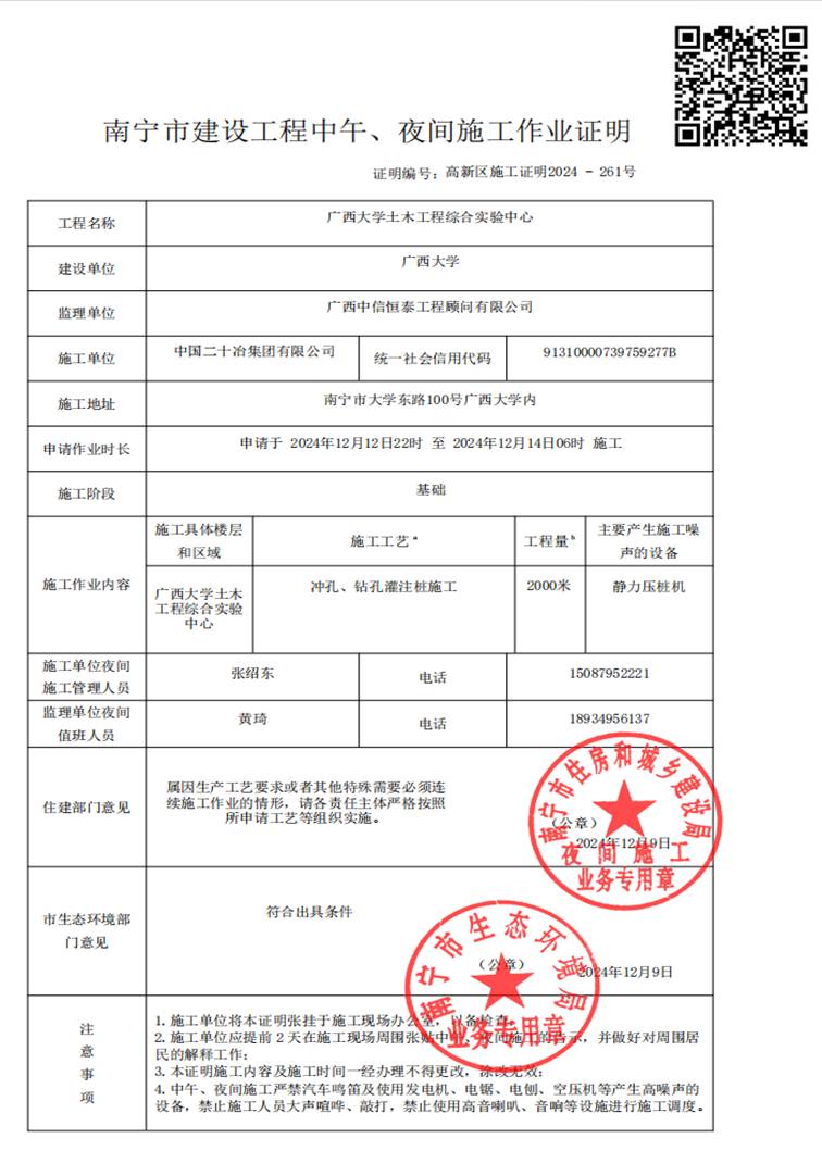 我单位承建的beat365正版唯一官方网站土木工程综合实验中心项目因施工工艺需要,在符合法律许可的夜间施工条件之下,经南宁市住房和城乡建设局、南宁市生态环境局核准,计划于2024年12月12日22:00—2024年12月14日6:00进行静压桩施工。我单位将严格按照建设局、环保局要求,采取有效措施尽可能减少影响。施工期间可能会对广大师生员工的日常生活造成一定的干扰。对此,我们深表歉意,敬请谅解。