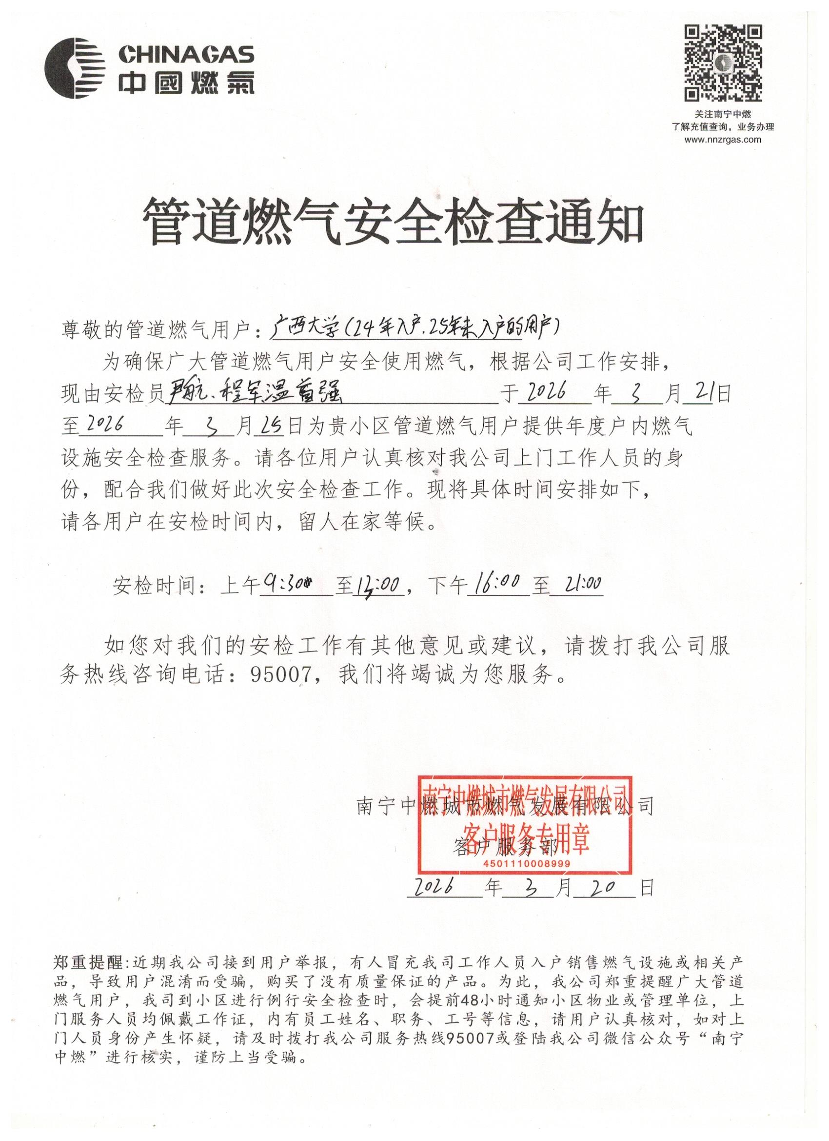 为保障校园用气安全,南宁中燃城市燃气发展有限公司将对20242025年期间未入户安检的管道燃气用户开展入户安全检查。请各位住户在此期间做好相关配合工作,现将具体通知如下: